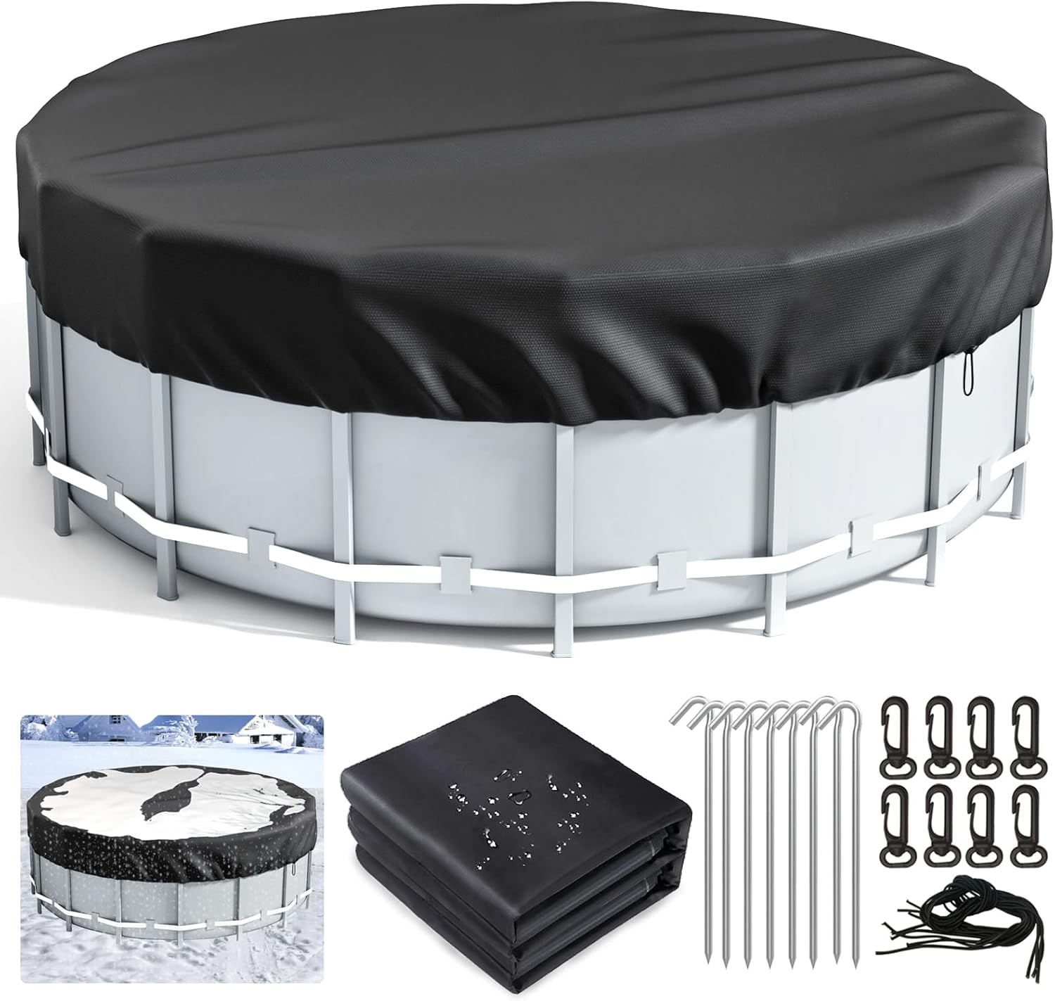 This heavy-duty 18FT round pool cover is designed to protect your above ground pool throughout all seasons. Featuring reinforced edges, multi-layer PE material, and a secure drawstring installation system, it keeps your pool clean from leaves, debris, rain, and snow. Perfect for both summer and winter use, ensuring durability and long-lasting protection.