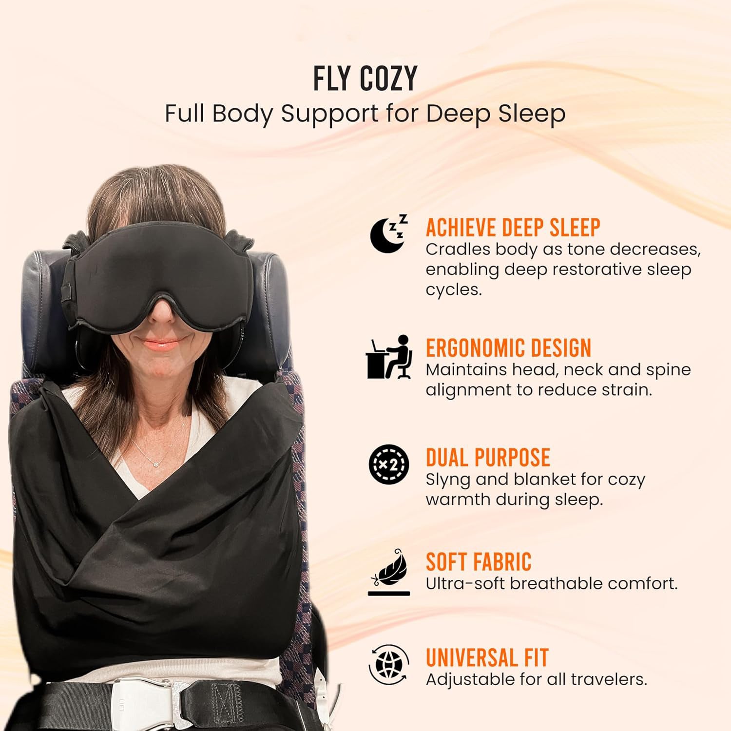 Combines a neck pillow, sleep mask, and body sling in one compact design — providing head, neck, and upper body support for restful upright sleep anywhere.