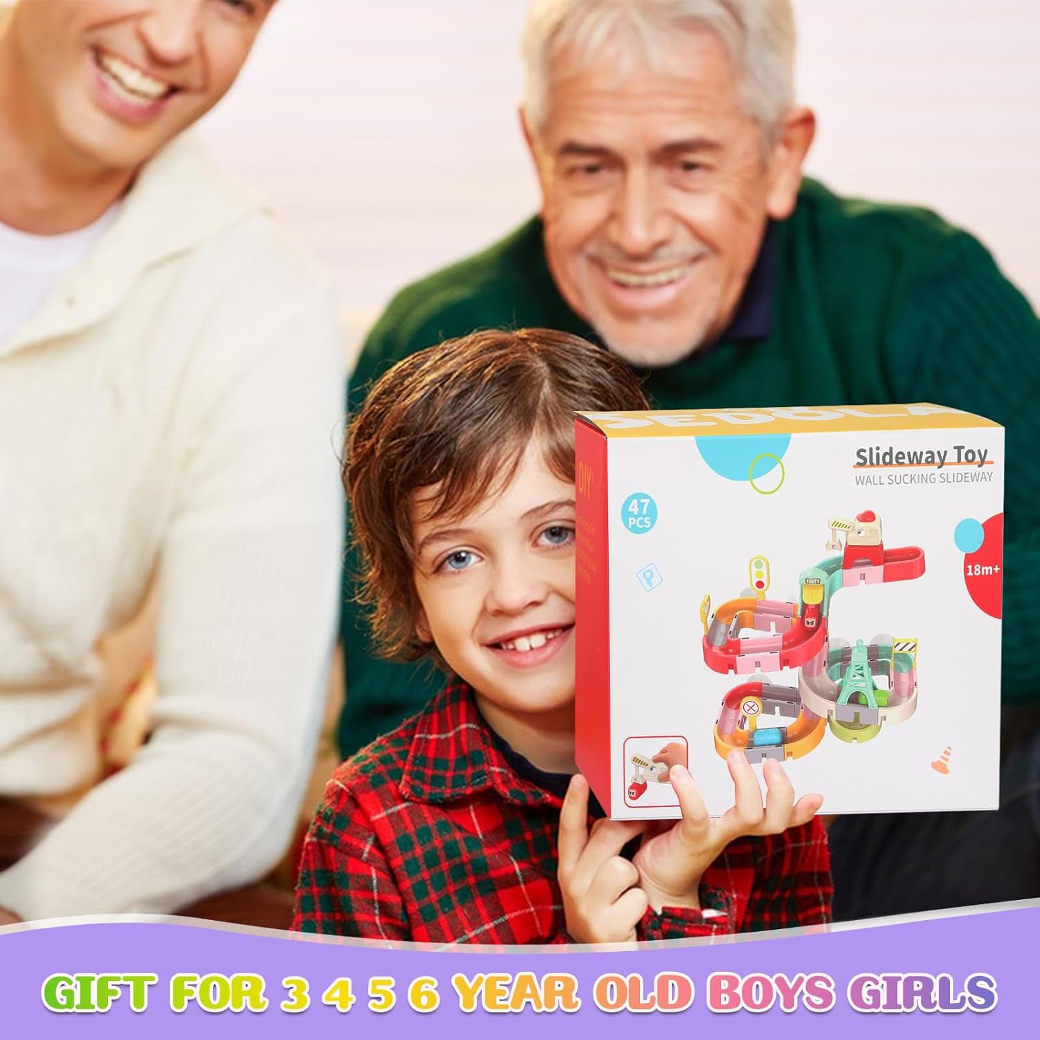 Encourages fine motor skills, problem-solving, and color recognition while assembling tracks and playing with cars and squeeze toys.