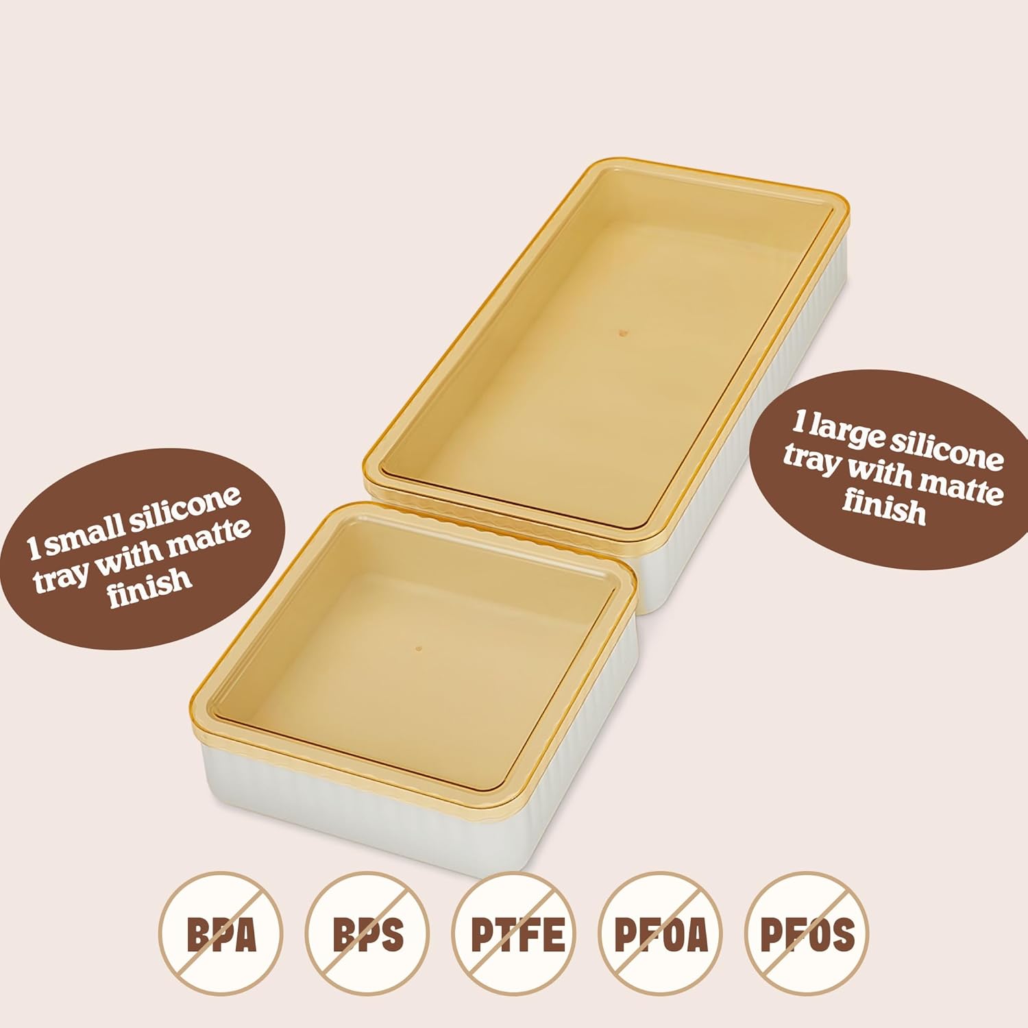 Silicone trays withstand up to 450Β°F, microwave- and fridge-safe.