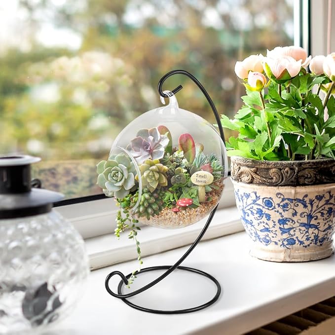 This air plant glass container set combines an elegant spherical glass vase with a minimalist matte black metal stand. Its beautiful and simple design suits indoor gardening, outdoor decoration, or bathroom window displays. Perfect for air plants, succulents, and small plants, it adds a natural and artistic touch to your living space.
