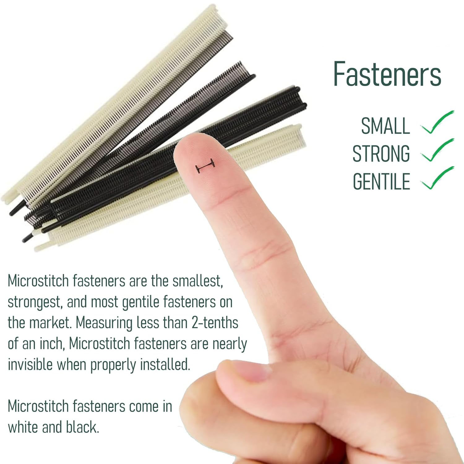 Includes the micro-stitch tool, extra-fine needles, and 1,080 mini fasteners (600 white, 480 black).
