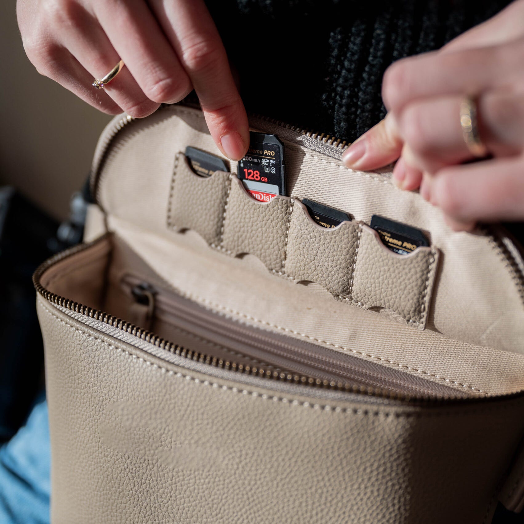 This versatile beige waist bag is designed for photographers who need both functionality and style. It features convenient compartments for your gear, including space for up to two cameras, SD cards, batteries, and more. With an adjustable waist strap, it ensures a comfortable fit, and the high-quality materials guarantee durability. The perfect choice for photographers who want easy access to their essentials while on the move.