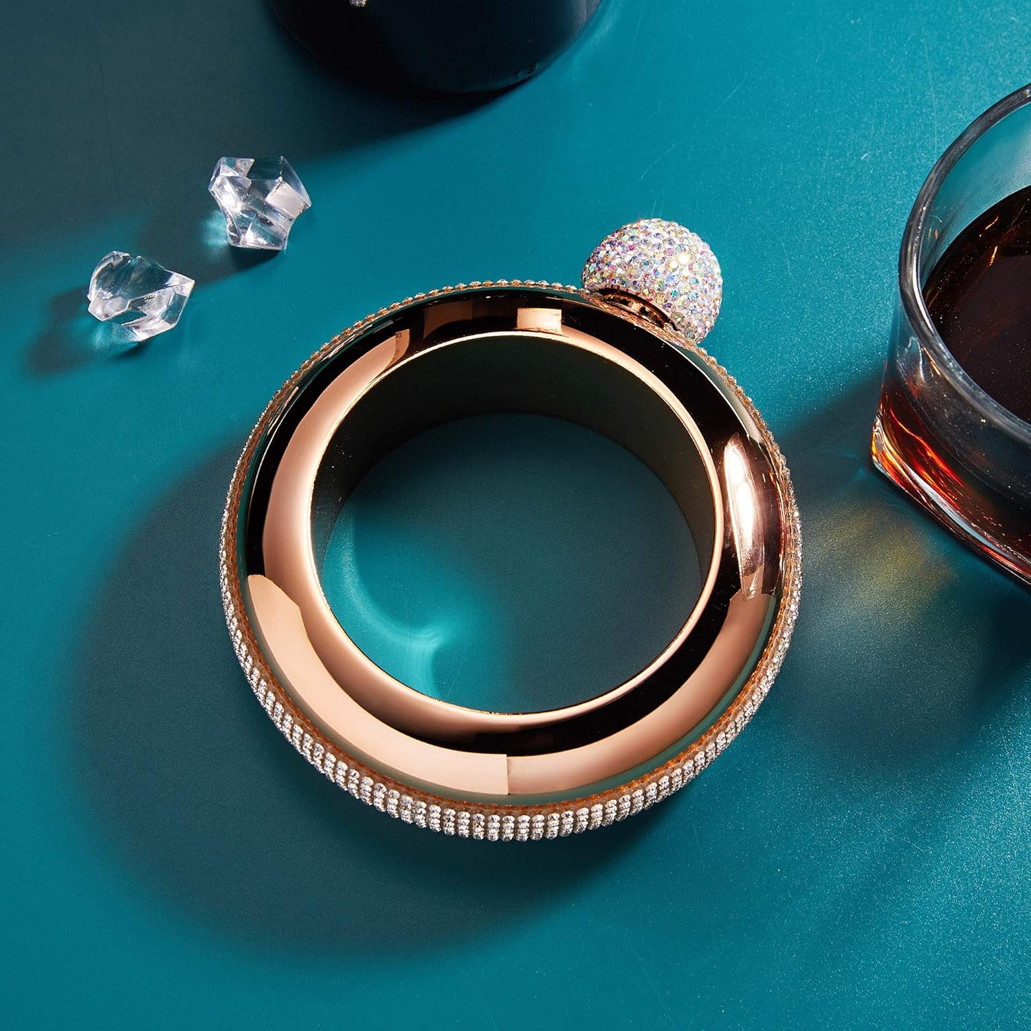 With its AB crystal cap and shiny stainless steel surface, this bracelet flask makes for a unique and thoughtful gift for those who love both jewelry and a good drink.
