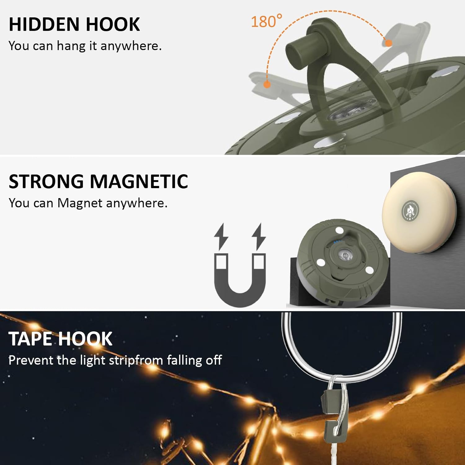 Functions as a camping light, decorative string light, work light, and flashlight. Suitable for camping, emergency lighting, SOS signals, and decorating tents, patios, or Christmas trees.