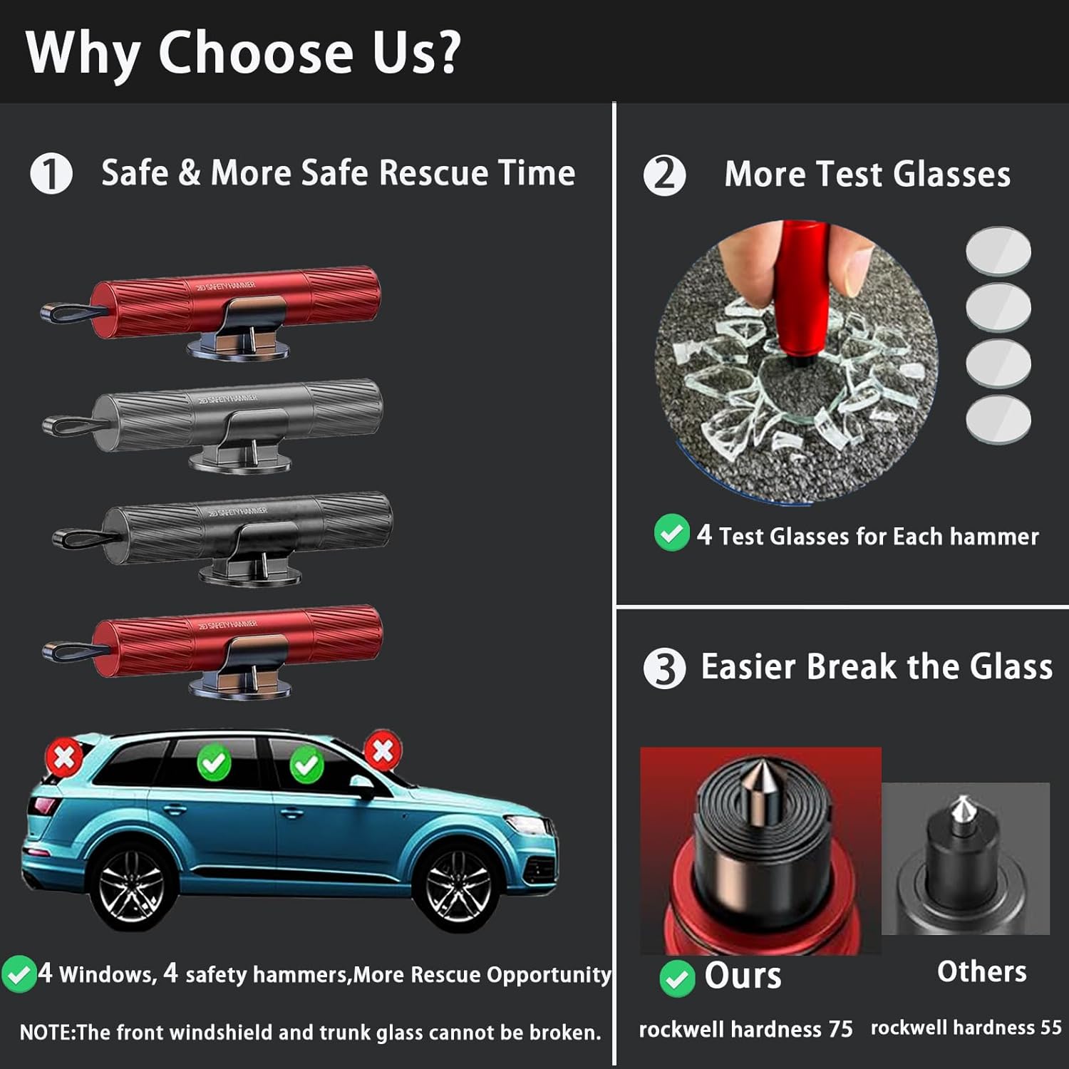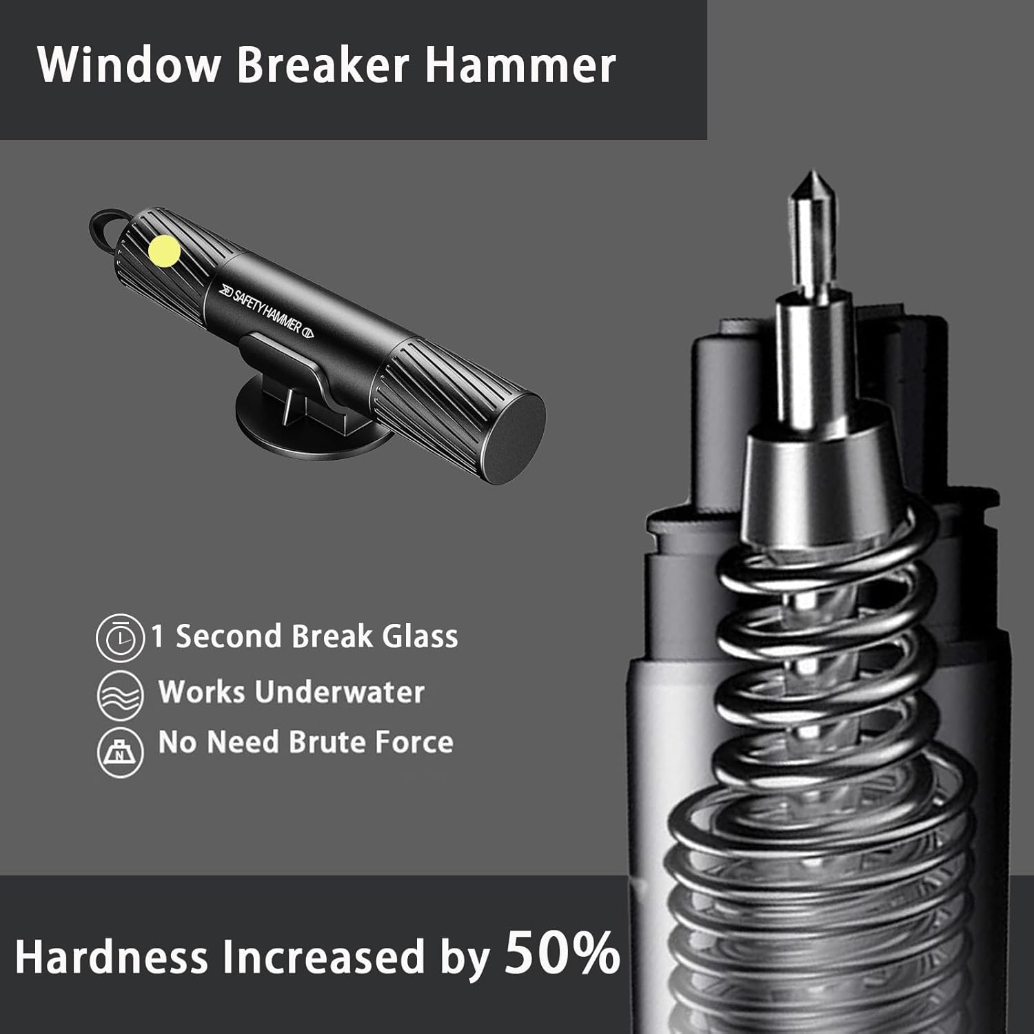 The combines a window breaker and seatbelt cutter in one compact device, an essential tool for roadside and underwater emergencies. Featuring a high-pressure spring with a tungsten steel tip, it shatters car windows in just one second with minimal force. The hidden U-shaped stainless steel blade cuts through seatbelts quickly and safely.This 4-pack set allows you to place one in each passenger area, ensuring quick access in emergencies. More hammers, more peace of mind.