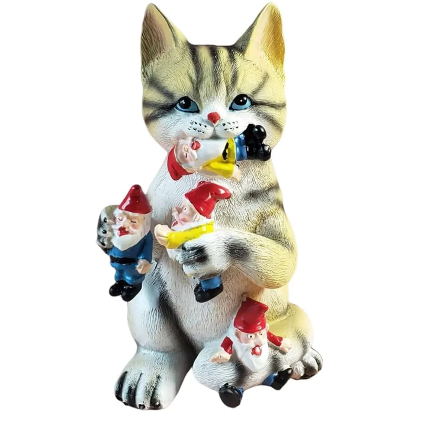A whimsical cat-eating-gnome statue that brings laughter and personality to any outdoor area.