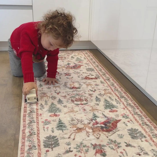 Add a festive touch to your home with this beige Christmas runner rug! Designed with Santa, Christmas trees, reindeer, and snowflakes, it brings a cozy holiday spirit to your hallway, kitchen, or any space in your home.
