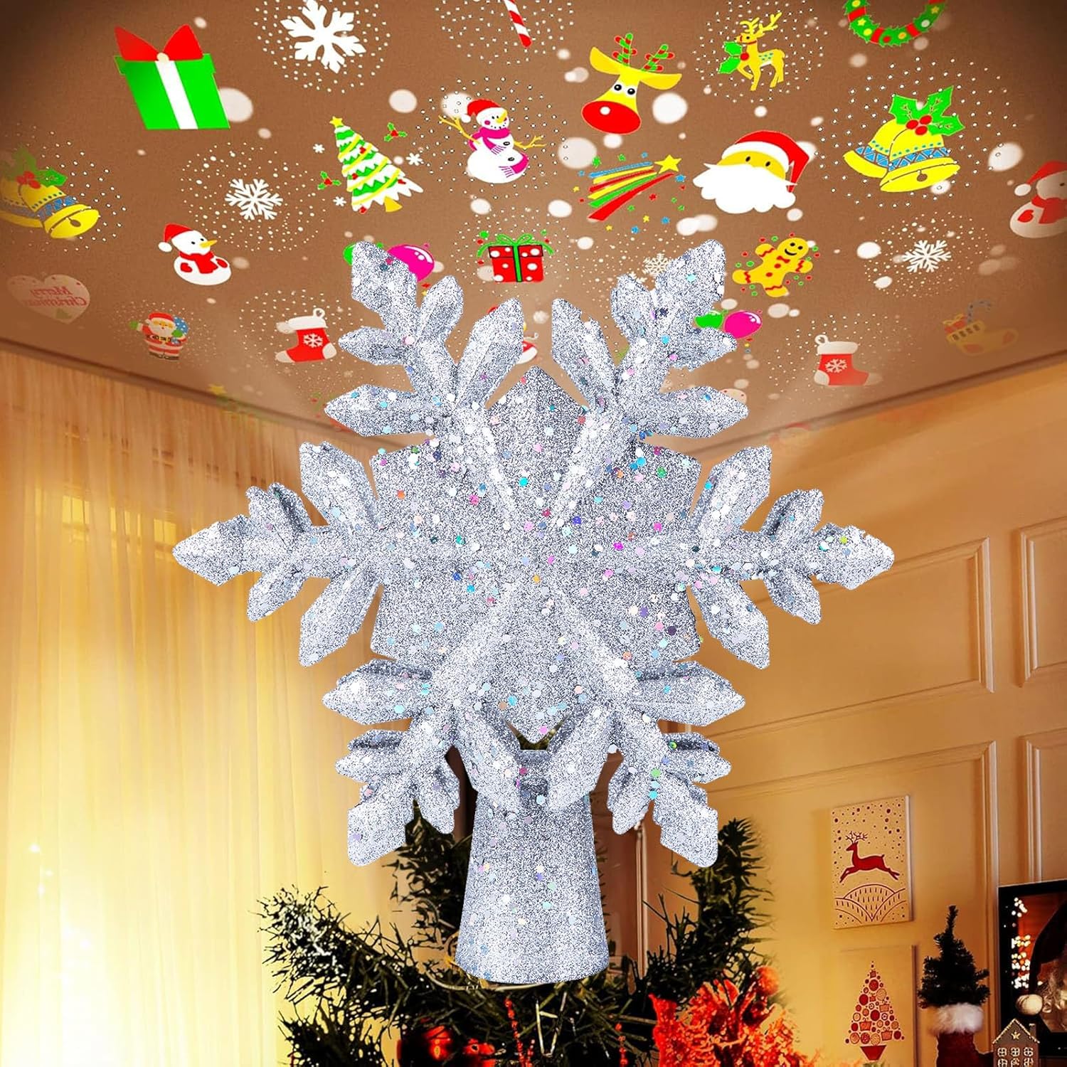 Light up your holiday season with this hollow snowflake Christmas tree topper featuring a built-in LED projector that casts dazzling snowflake patterns onto your ceiling. Designed with 6 projection modes, this elegant silver-glitter tree topper instantly transforms your space into a magical winter wonderland. Perfect for Christmas, New Year celebrations, weddings, and festive parties!
