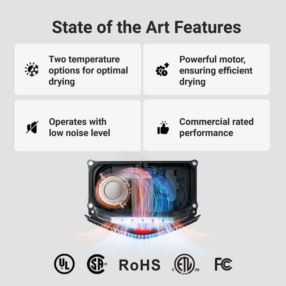 This compact electric hand dryer is an advanced touchless solution designed for both commercial and residential bathrooms. Equipped with a high-speed brushless motor, it delivers exceptional performance while being one of the most efficient and eco-friendly options available.