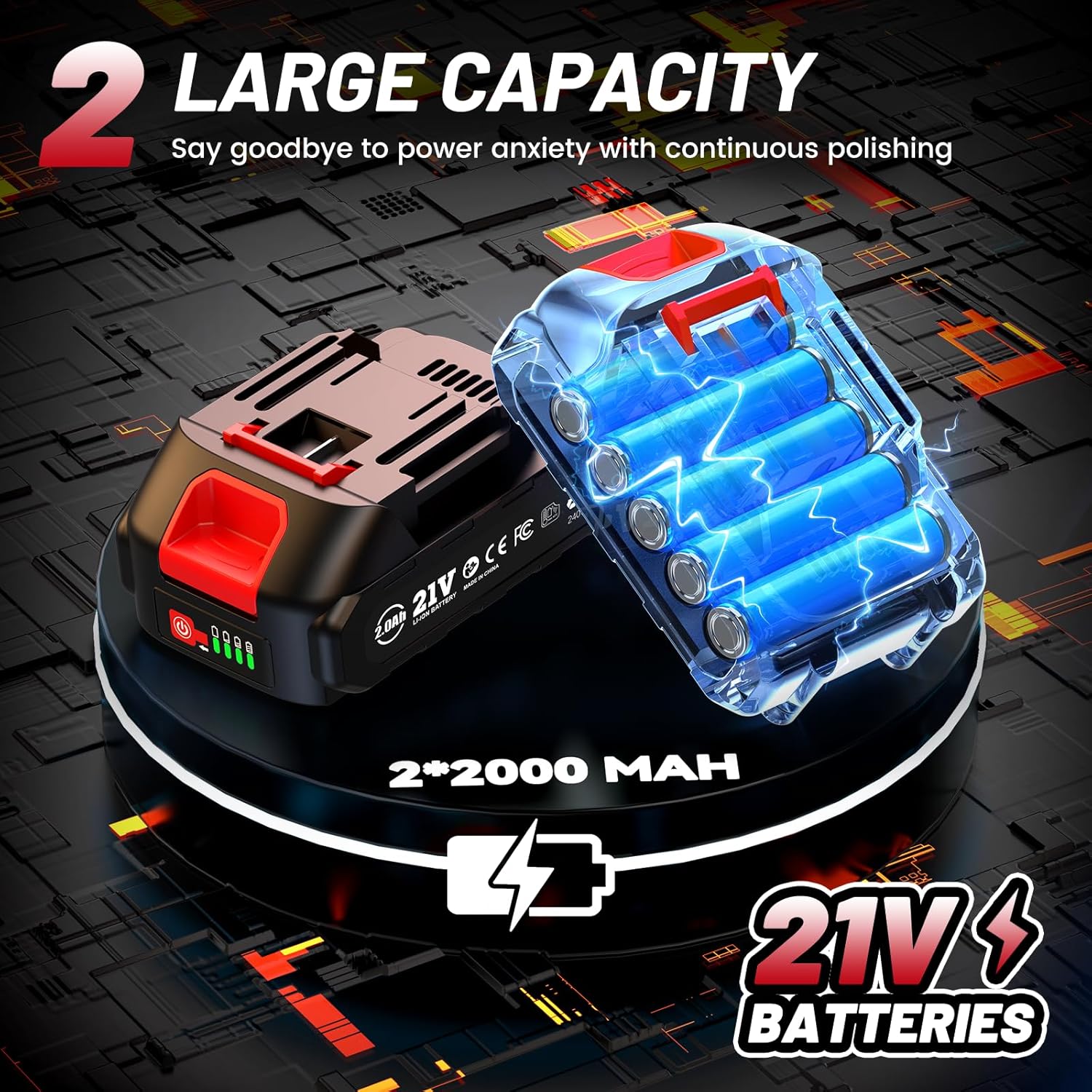 Equipped with a high-torque motor and 21V rechargeable batteries for stable, efficient polishing without the hassle of cords.