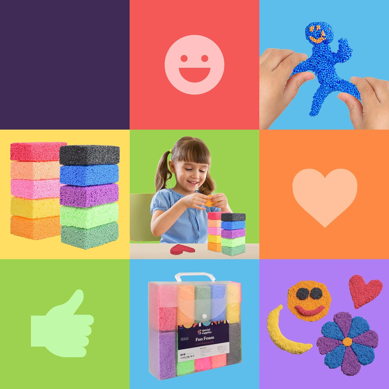 Kids can build, mold, and design 3D creations using soft foam clay, inspiring artistic thinking and imaginative play while having fun with friends.