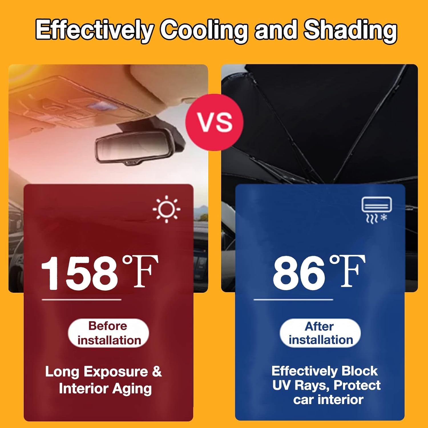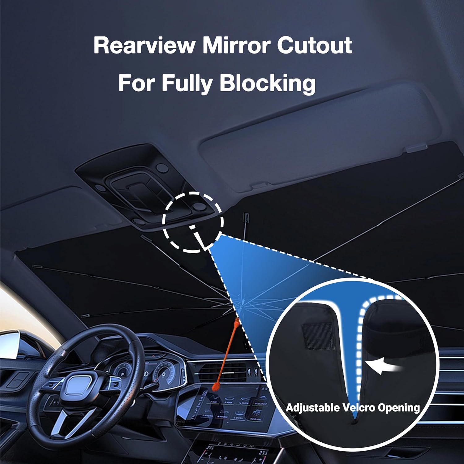 Measuring 57" × 31", this large umbrella-style sunshade fits sedans, hatchbacks, SUVs, vans, pickup trucks, and more.
