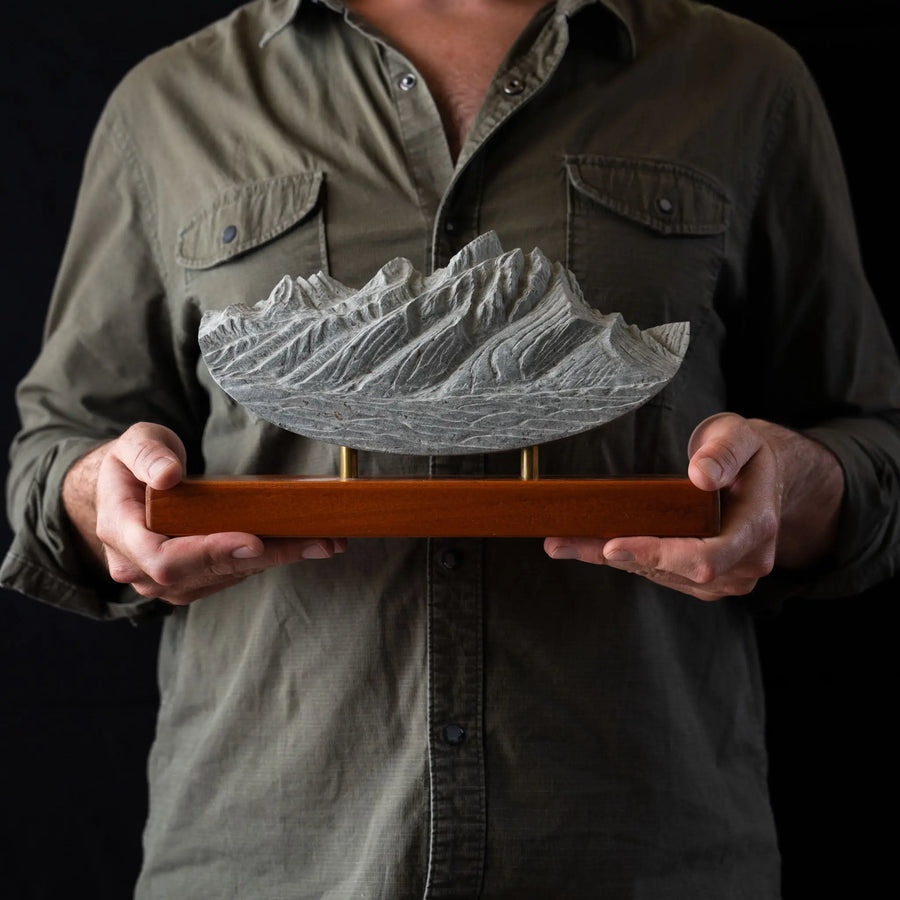 Handcrafted from solid andesite stone, this sculpture captures the grandeur of Grand Teton Peak. The intricate details change with the light, bringing the scene to life. A perfect piece to evoke memories of your favorite mountain moments.
