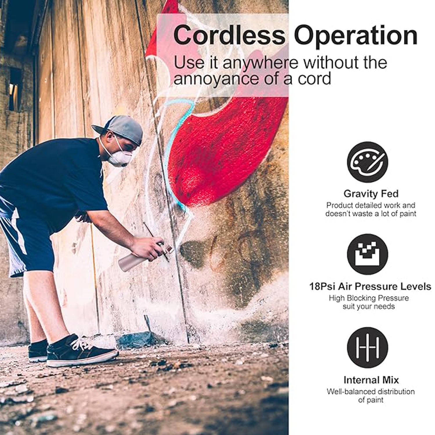 This stylish and portable wireless spray gun kit features a sleek, hole-free body design, making it lightweight and easy to carry. It suits a variety of spray painting needs: low pressure at 20 PSI for makeup applications, and high pressure at 27 PSI for art painting, cake decorating, nail art, model coloring, and more—perfect for beauty and craft projects.