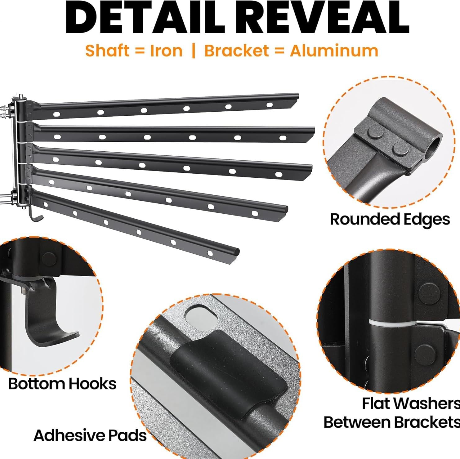 Five 180° rotating arms plus an additional hook provide 25% more drying space than standard racks. Reinforced hanging holes keep clothing and gear securely in place.