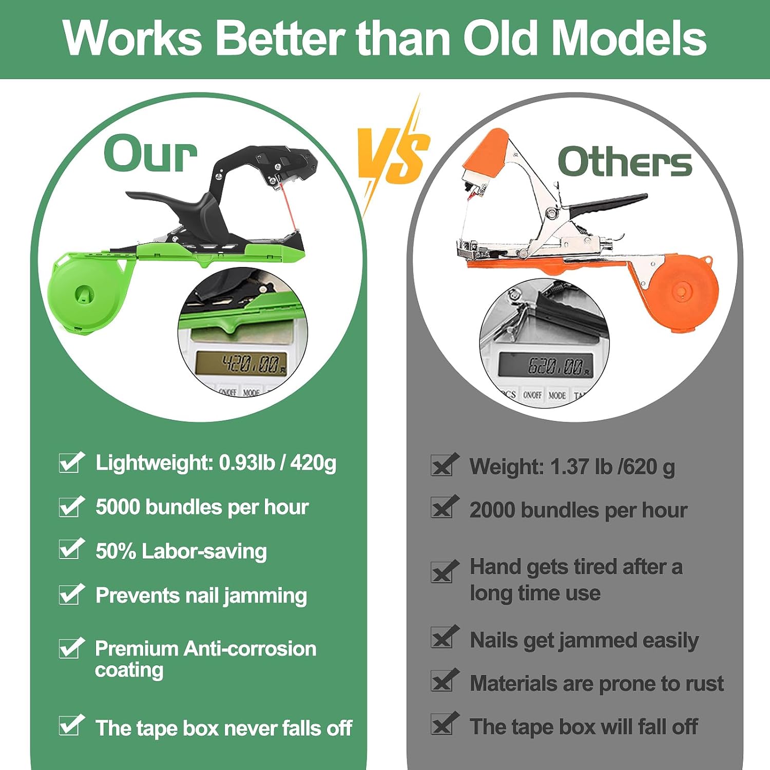 This upgraded garden tape tying tool is designed for gardeners and farmers to quickly and efficiently bind vines, tomatoes, grapes, and other plants. Featuring a wider 50mm jaw and lightweight design, it saves up to 50% of manual labor time compared to older models.