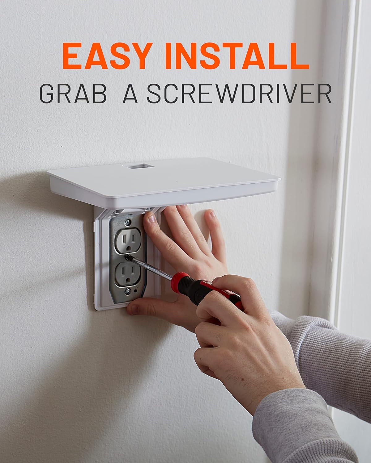 Reclaim your countertop space with this ultra-wide outlet shelf that connects directly to your wall outlet. Supports up to 5 lbs (≈ 2.5 kg) of items and offers 80% more shelf space than standard outlet shelves, perfect for large smart speakers, routers, tablets, and other bulky electronics.