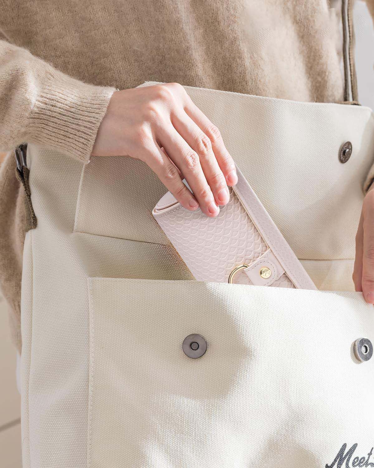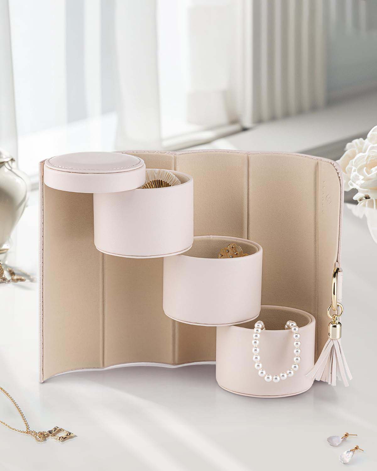 Three equal-sized compartments with a stair-step rotation structure, rollable and secured with a snap button, offering quick access to your jewelry.